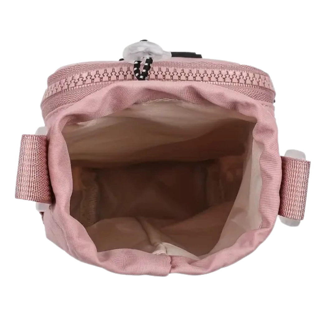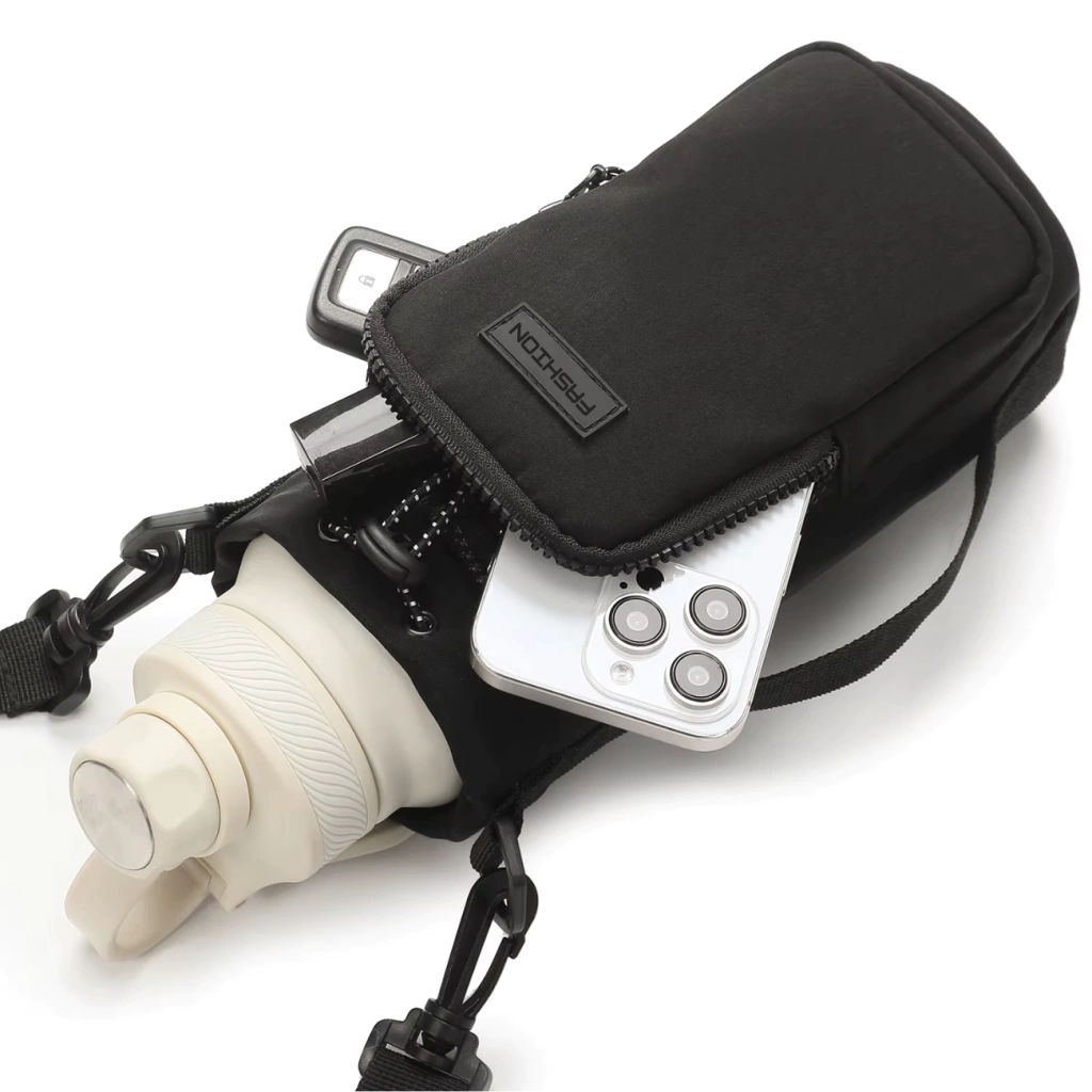 Bolsa para garrafa de água e objetos pessoais: fone, chave, cartão. Possui 1 compartimento ‘aberto’ para garrafa e 1 compartimento frontal com zíper;