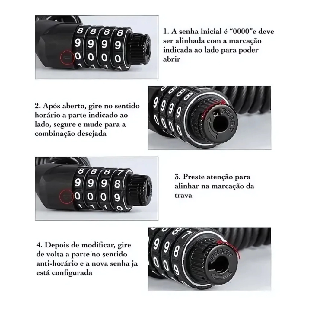 Cadeado trava com senha por segredo, ideal para prender capacete na moto, bicicleta ou mochila;