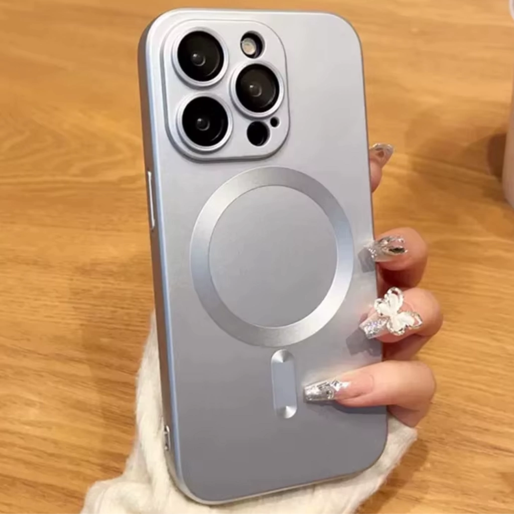 Capa protetora para celular, modelo MagSafe, contém ímãs que auxiliam no carregamento rápido e é própria para o carregamento por indução