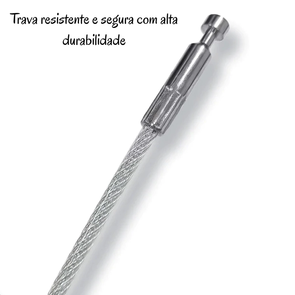 A trava tem as bases de plástico resistente e medindo: 6 cm de largura X 5 cm de comprimento X 2,5 cm de altura e 1 cabo resistente revestido de plástico para proteção, medindo 18 cm de comprimento total e 1 chave;